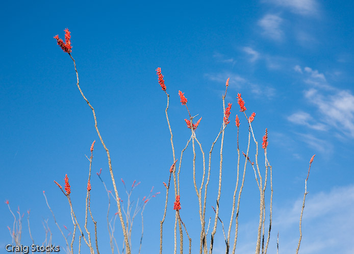 Bright red flowers on the ends of an ocotillo