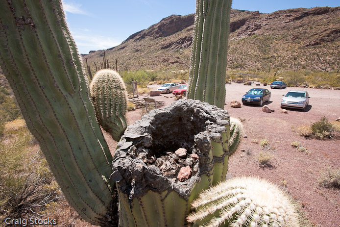 Rocks apparently tosssed inside the top of a saguaro cactus that's broken off about ten feet off the ground.