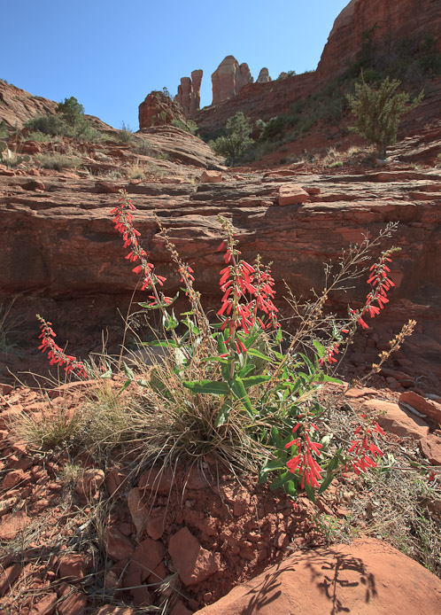 Bright red blossoms and bright red rock in Sedona, Arizona