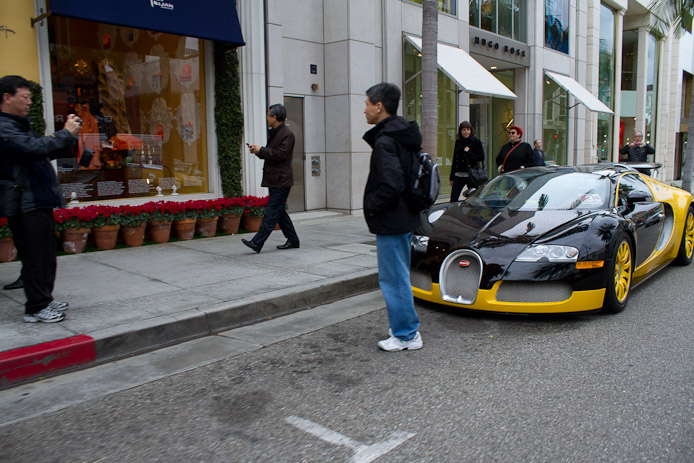 A fancy car (Bugatti Veyron - the most expensive production car starting at $1.7 million) parked along Rodeo Drive. Notice the crowd of bystanders taking pics.